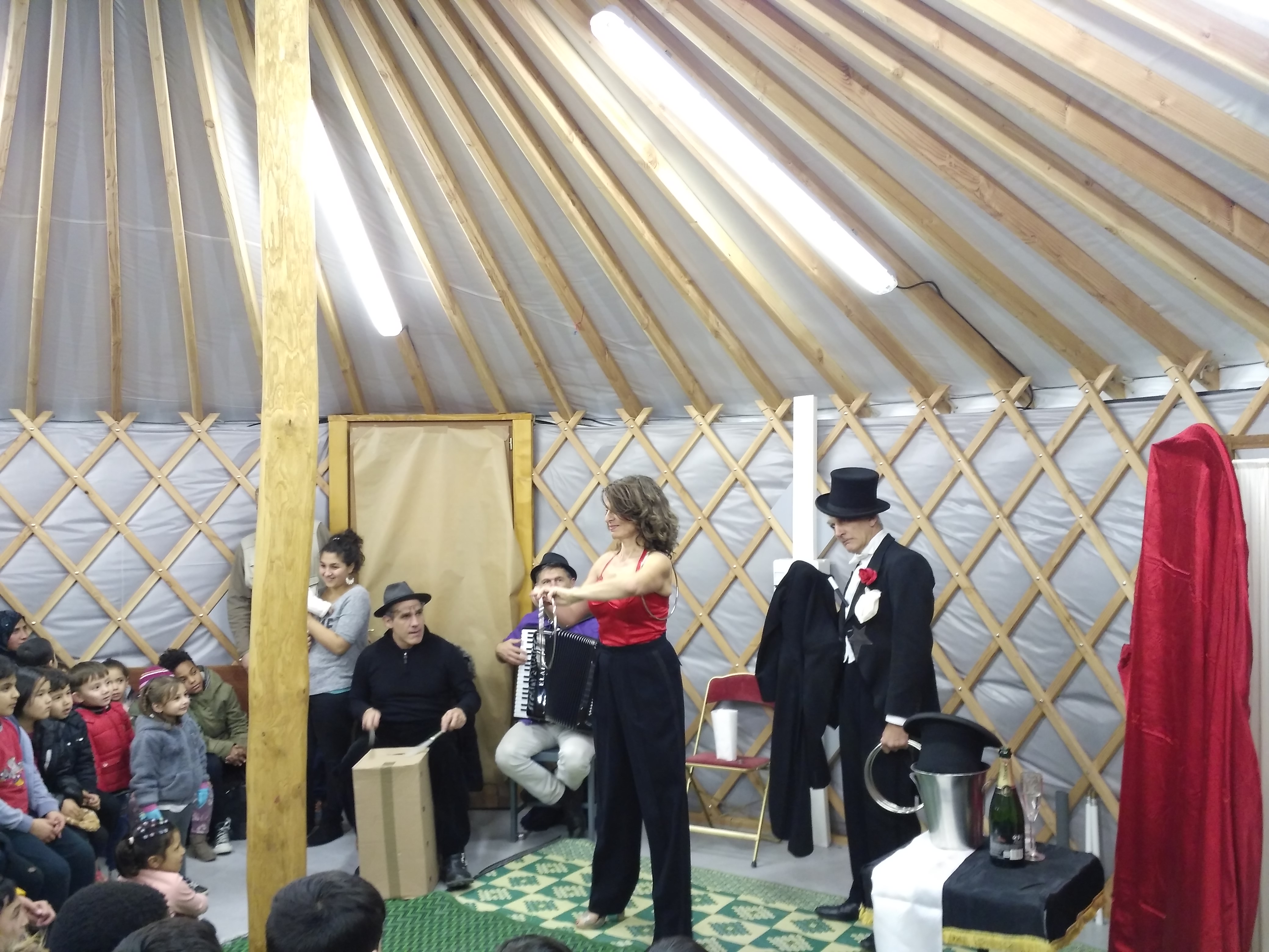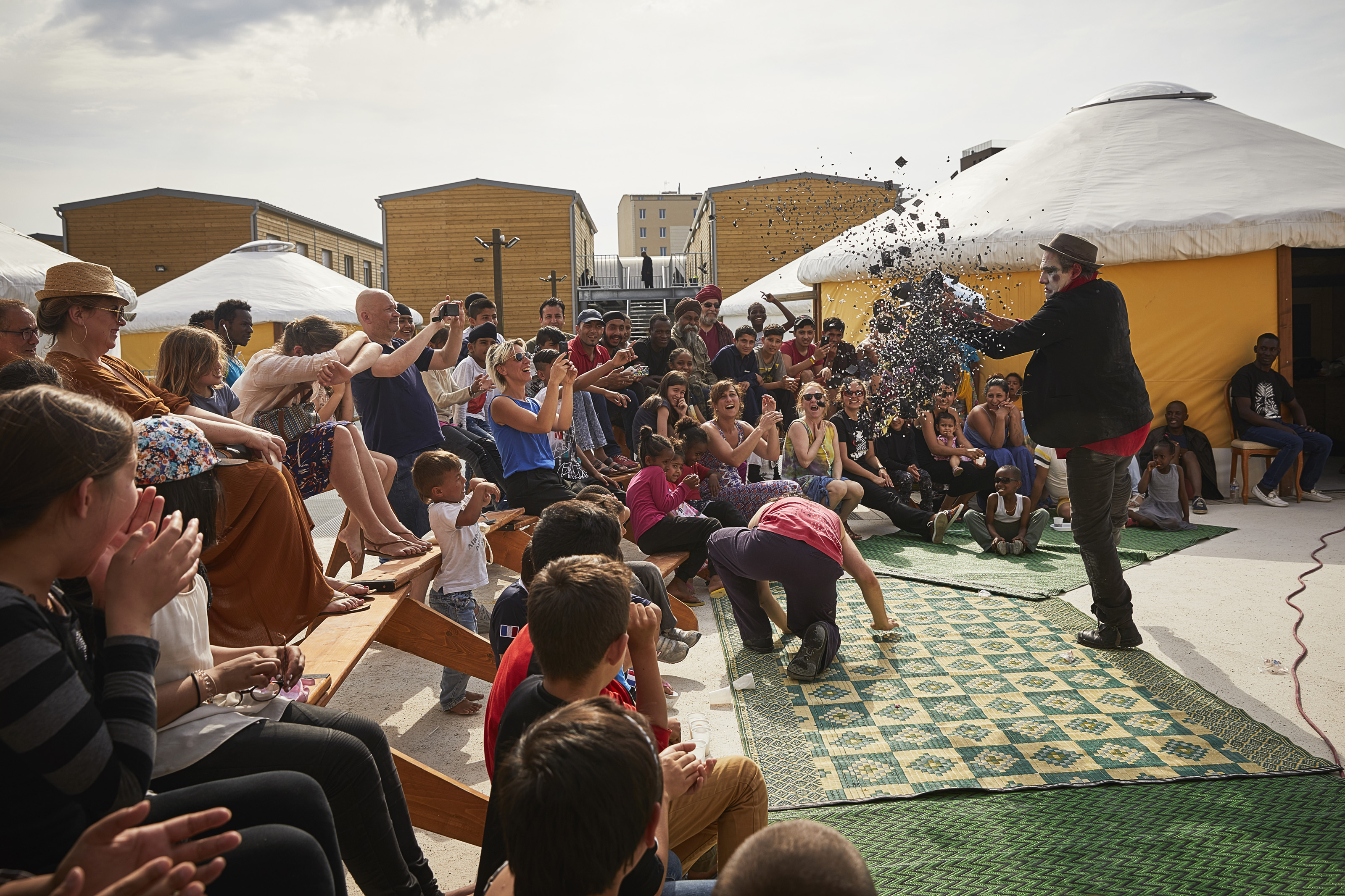 CSF est intervenu à deux reprises dans les Centres d’Hébergement d’Urgence (CHU) d’Ivry-sur-Seine en juin 2017 et en décembre 2017, en partenariat avec Emmaüs Solidarité. Les CHU proposent à toute personne dans le besoin, et ce, sans conditions d’acceptation, un accueil, un lit, un repas et un accompagnement. De nombreuses personnes sans domicile fixe et/ou en situation de migration sont ainsi hébergées dans ces lieux. L’association a proposé des spectacles aux enfants en situation de migration ainsi qu’à leurs familles. La Fanfare Fans FronFières, fanfare de bénévoles de CSF, est venue en soutien en décembre.